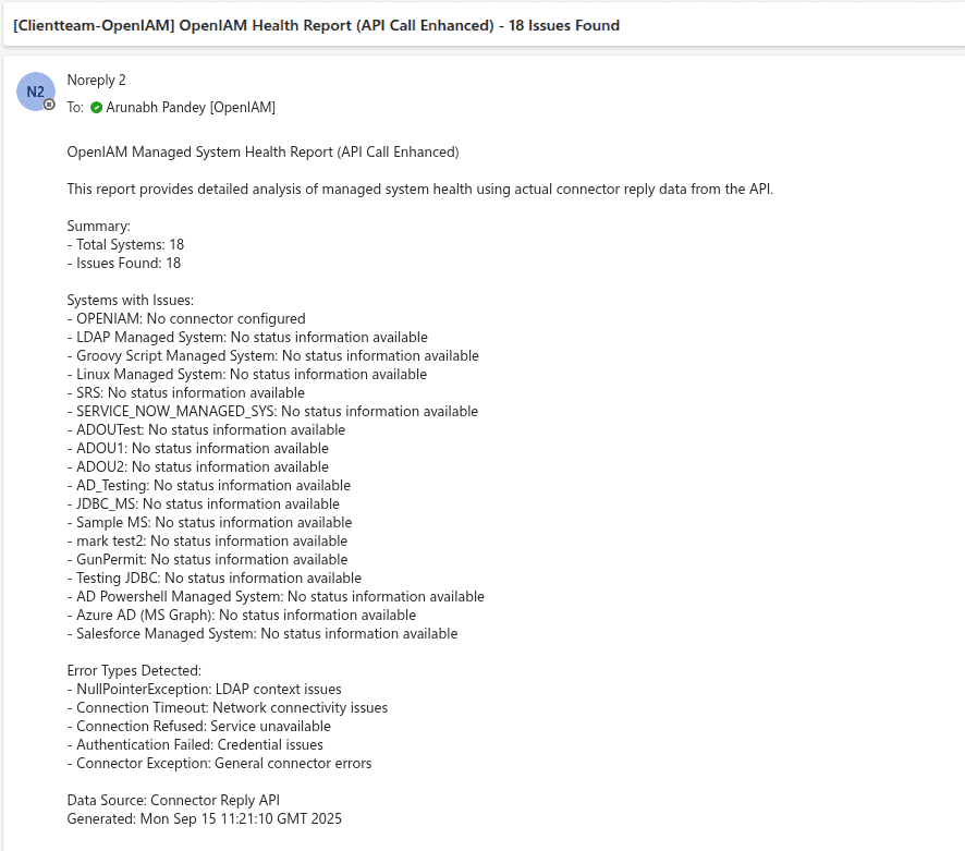Once the feature is configured, OpenIAM will check all managed system health every 1 minute. Any issue will trigger an automated email to the selected group. Example of a received alert email is given below.