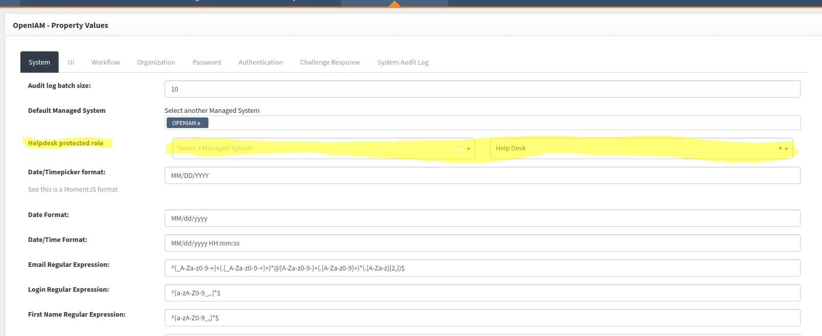 Select Administration > System Configuration and select the System tab. Assign Helpdesk protected role to the role attributed to help desk personnel. If this is not assigned, the help desk profile protection workflow is disabled.