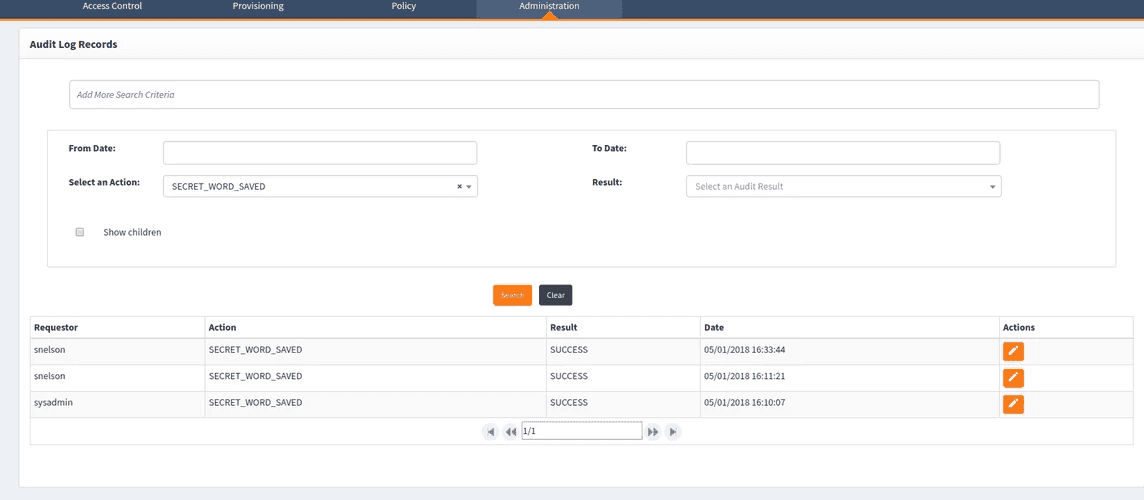 - To view a log of users who have saved their user secret, select Select an Action > SECRET_WORD_SAVED and select Search. (AuditAction = SECRET_WORD_SAVED)