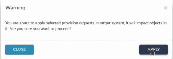 Click Apply if you want to run the provision request or Cancel if not. In case there are other requests made by previous user, clicking Apply will lead to another warning popping up.