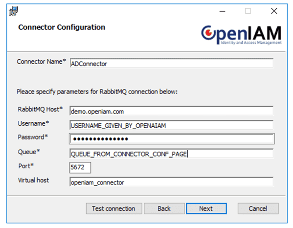 Password#51, however, this is usually changed after initial configuration. - Queue: this parameter should be taken from the connector configuration page inside OpenIAM. It is described above.