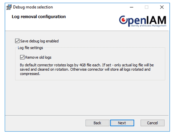 You will be asked to configure log settings. If you are installing the connector for the first time you may want to set debug mode on to be able to track what is happening on the connector side when you run requests from OpenIAM.