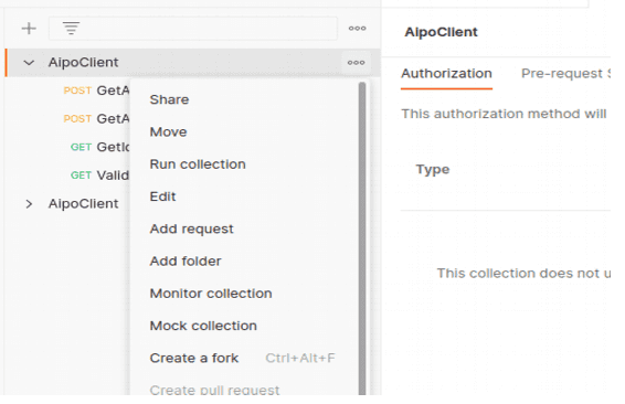 Note: Variable name should be the same as mentioned in the document, these variables are global to the AipoClient collection and are being used in multiple places, any changes in the name might lead to failure of getting the JWT token.