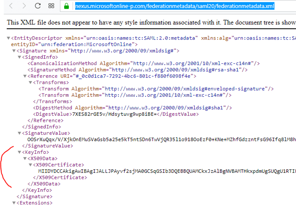 Link to official Microsoft metadata: https://nexus.microsoftonlinep.com/federationmetadata/saml20/federationmetadata.xml