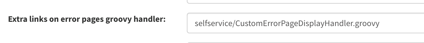 package selfserviceimport org.openiam.ui.model.Hyperlinkimport org.openiam.ui.web.mvc.error.handler.DefaultErrorPageDisplayHandlerclass CustomErrorPageDisplayHandler extends DefaultErrorPageDisplayHandler {public CustomErrorPageDisplayHandler() {}@Overridepublic List<Hyperlink> getAdditionalHyperlinks() {return [new Hyperlink(text: "Request access", href: "your_custom_link"),new Hyperlink(text: "Go back to …", href: "your_custom_link")] as List}}