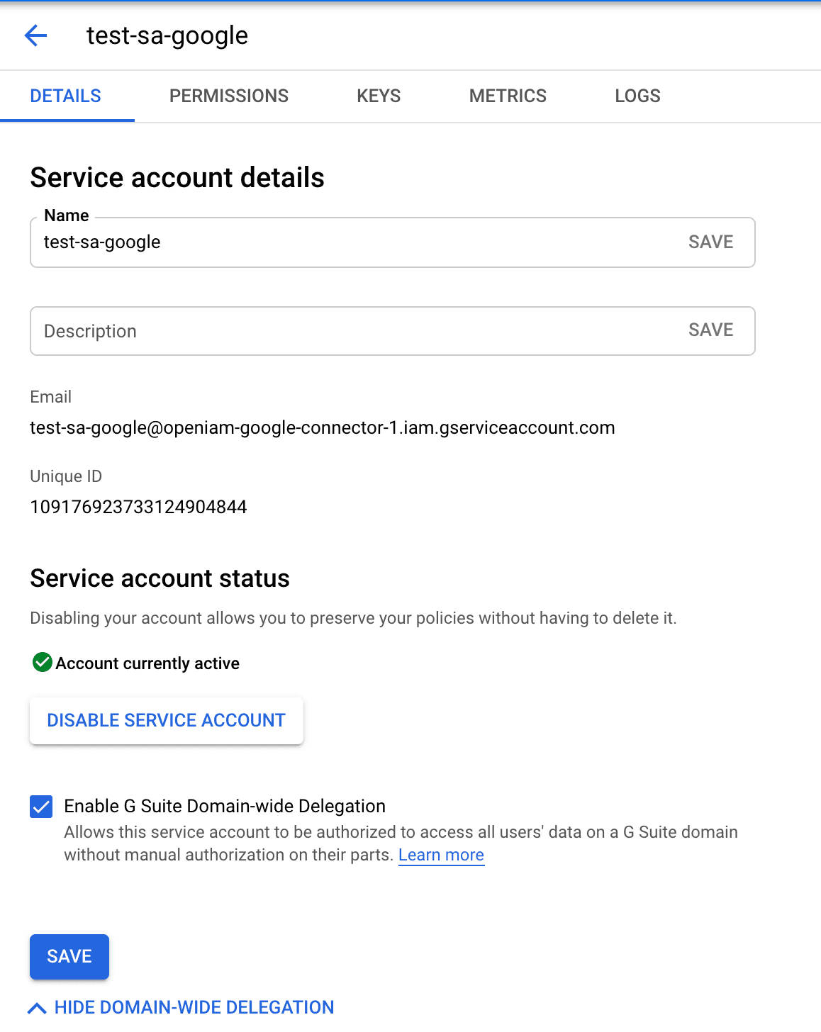 Delegate domain-wide authority to your service account by selecting "Enable Google Workspace Domain-wide Delegation" under "Detail" tab.