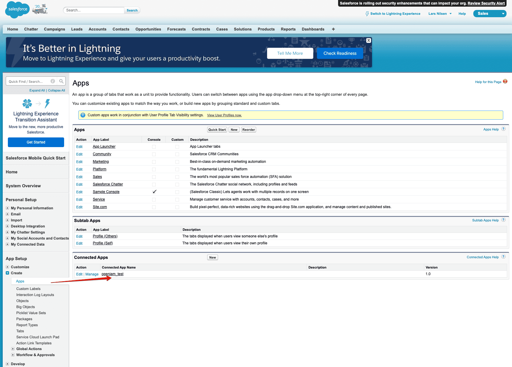 - Go to Create → Apps → Connected Apps -> click by name