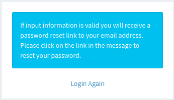 The end-user has the option to enter their login ID and have the reset password link sent to the e-mail address associated with that ID, or enter their e-mail address. After providing the option of your choice, click on Submit Password Reset Link. You will be shown the following confirmation screen next: