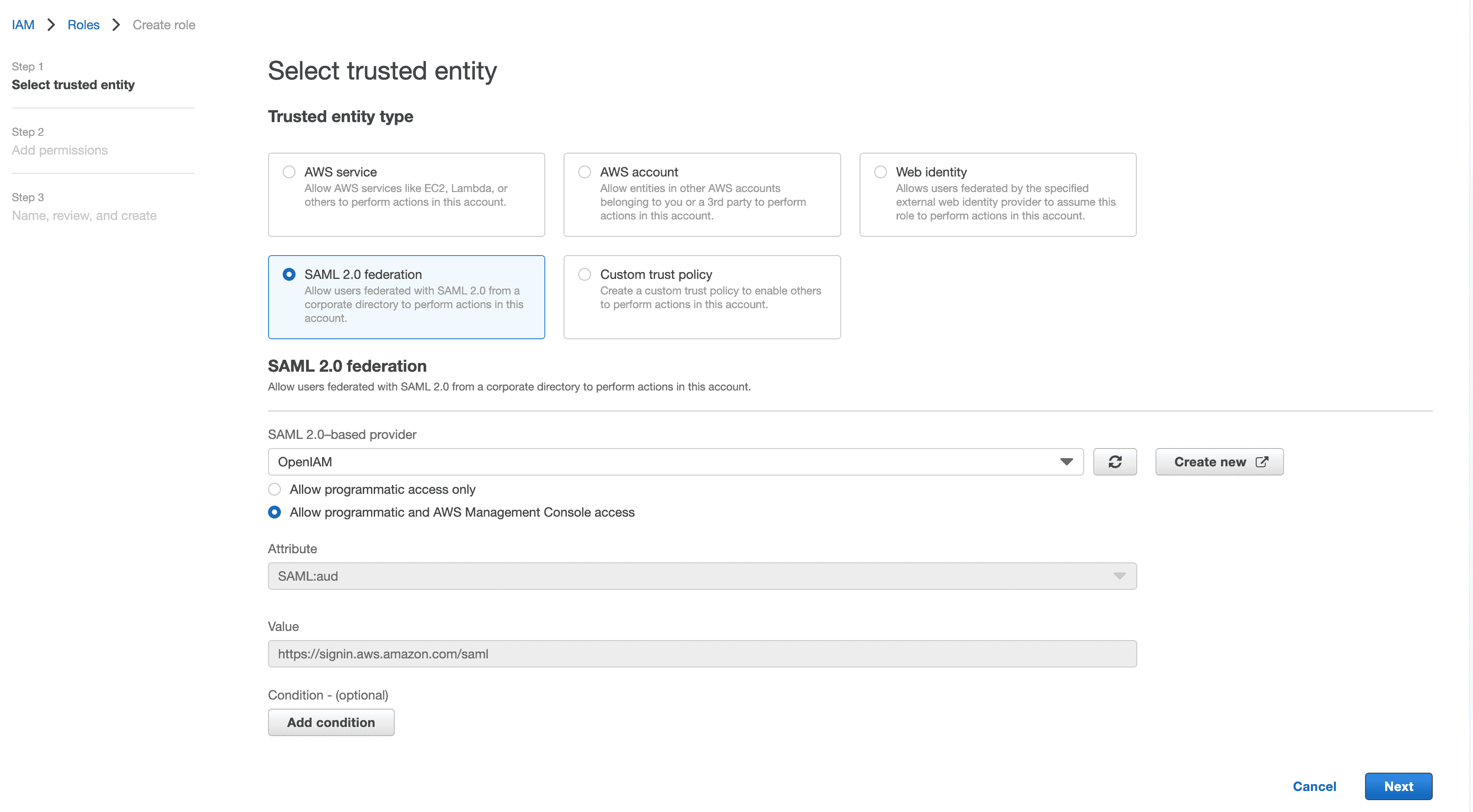 Form a string of identity provider ARN and role ARN, these values should be coma separated. You should have string similar to arn:aws:iam::00000000: saml-provider/OpenIAM,arn:aws:iam::00000000:role/OpenIAM
