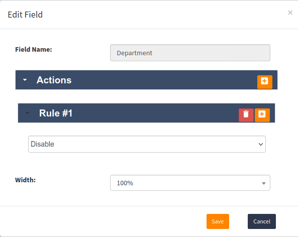 Next, you can assign rules to individual fields to make the page dynamic. Under the Actions column, click on the pencil icon of the corresponding field you wish to edit. On the pop-up window, click the plus sign to the right of the Actions label. Under Rule, you can choose an option from the drop-down menu to assign a rule to the field. The rules available include: