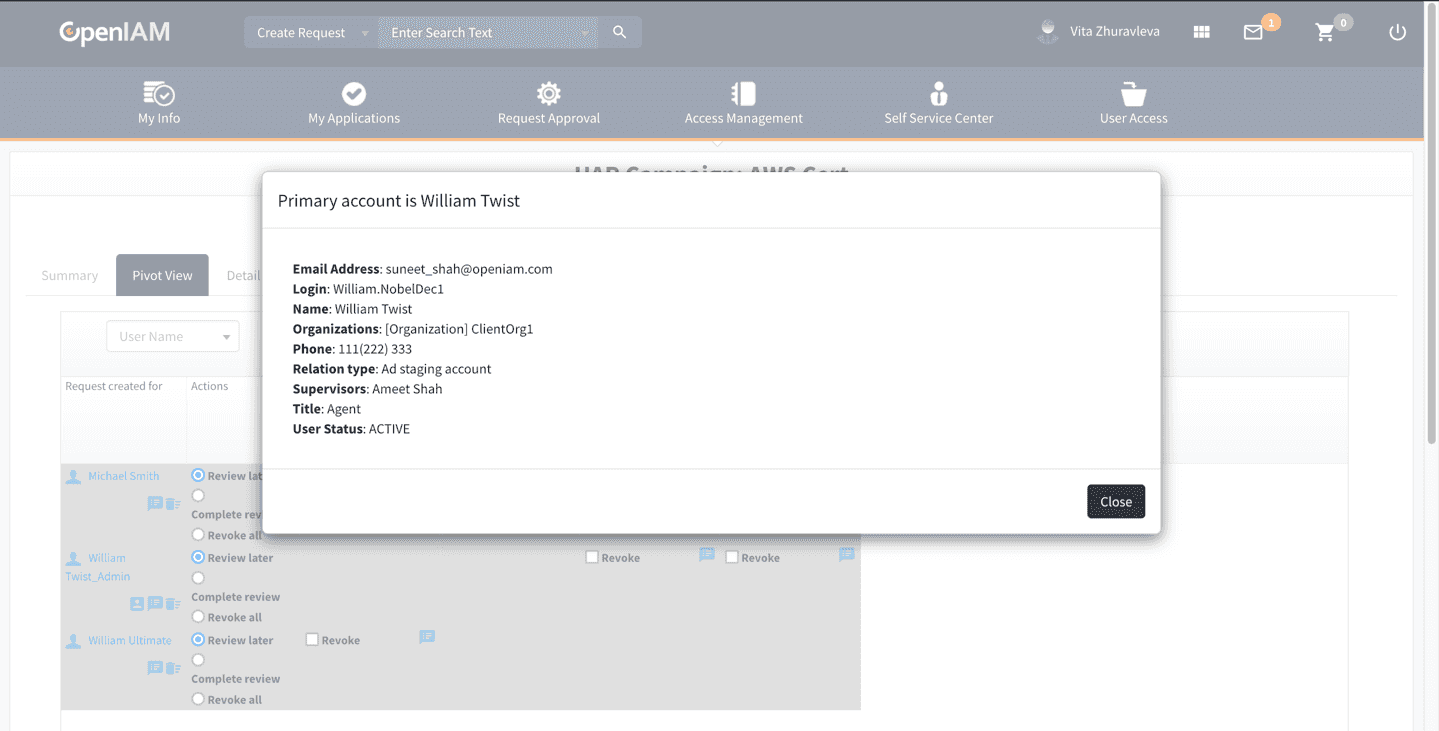 OpenIAM can initiate a position change workflow if the primary user has a change in job function. If the target user has a set of related accounts, then they must be reviewed as well. In this case, when a manager performs a review of access as part of a position change request, he/she will receive one request for a primary account and a separate request for the related account.