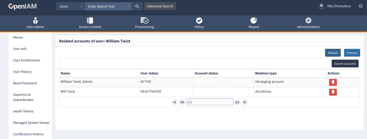 A user may have more than one account in OpenIAM or in a target system. An example of this would be an administrator that has a regular user account and an admin account. Each has its own distinct set of privileges, but both accounts are related to the same user profile.
