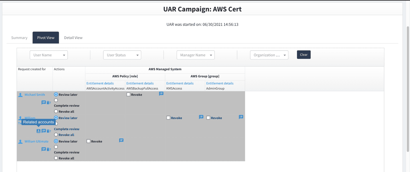 If a related account is part of an access certification campaign, the reviewer will see the pictogram in the pivot view as shown in the example below.