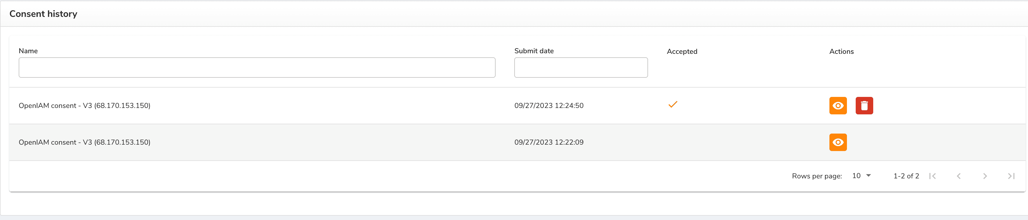 - Go to SelfService > SelfService Center > Consent history. You will see the versions of consents and the actions to it as shown below.
