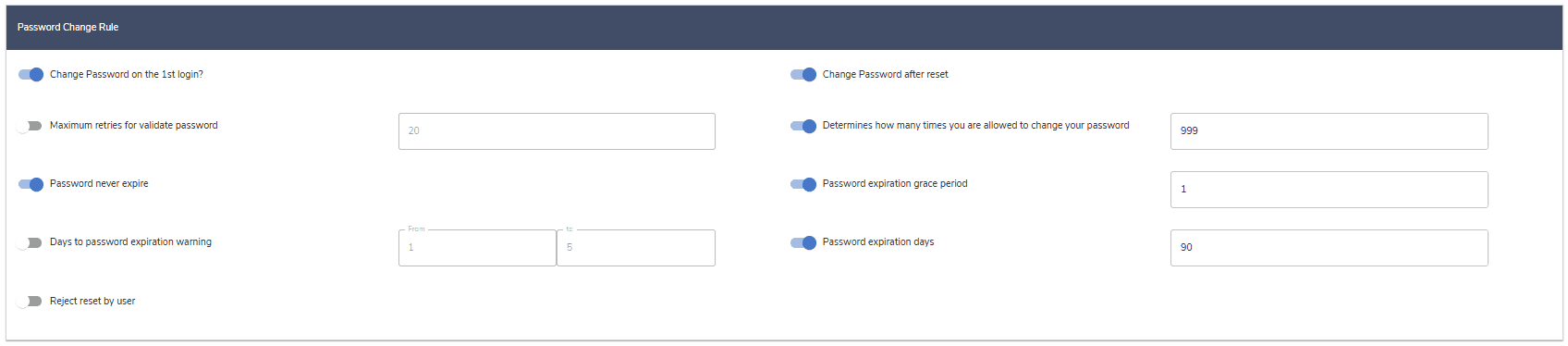 | Reject Password Which Equals to LoginId | If this is checked, the policy forbids the password to be the same as LoginId. |
