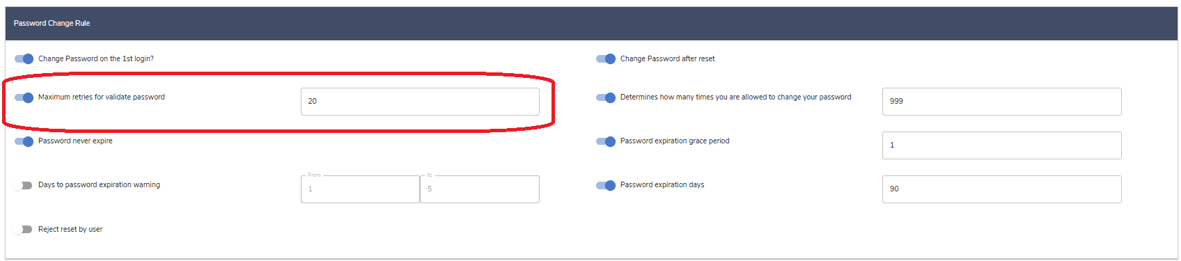 | Password Length | Determines the length of the password. Minimum value here is 1, and maximum value of characters is 128. |