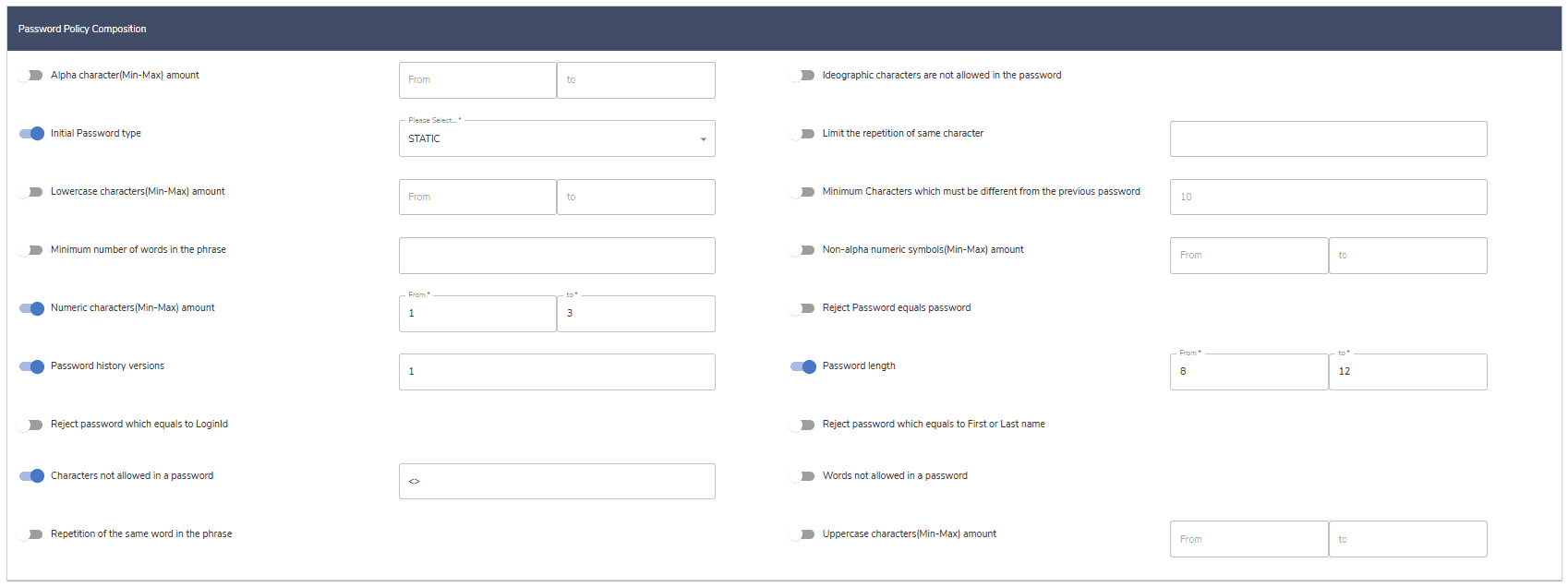 This section of the page allows configuring the details of the required password composition. A description of each field is provided in the table below.