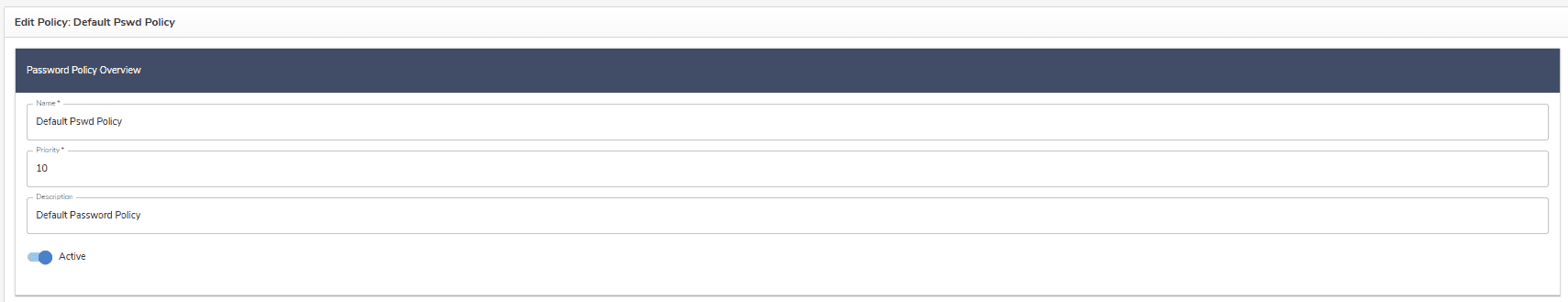 - There are several password policies in OpenIAM: The Default Password Policy with a priority of 10; CustomPolicy1 with a priority of 14 (more restricted than the default password policy); _AD Password Policy_with a priority of 15.