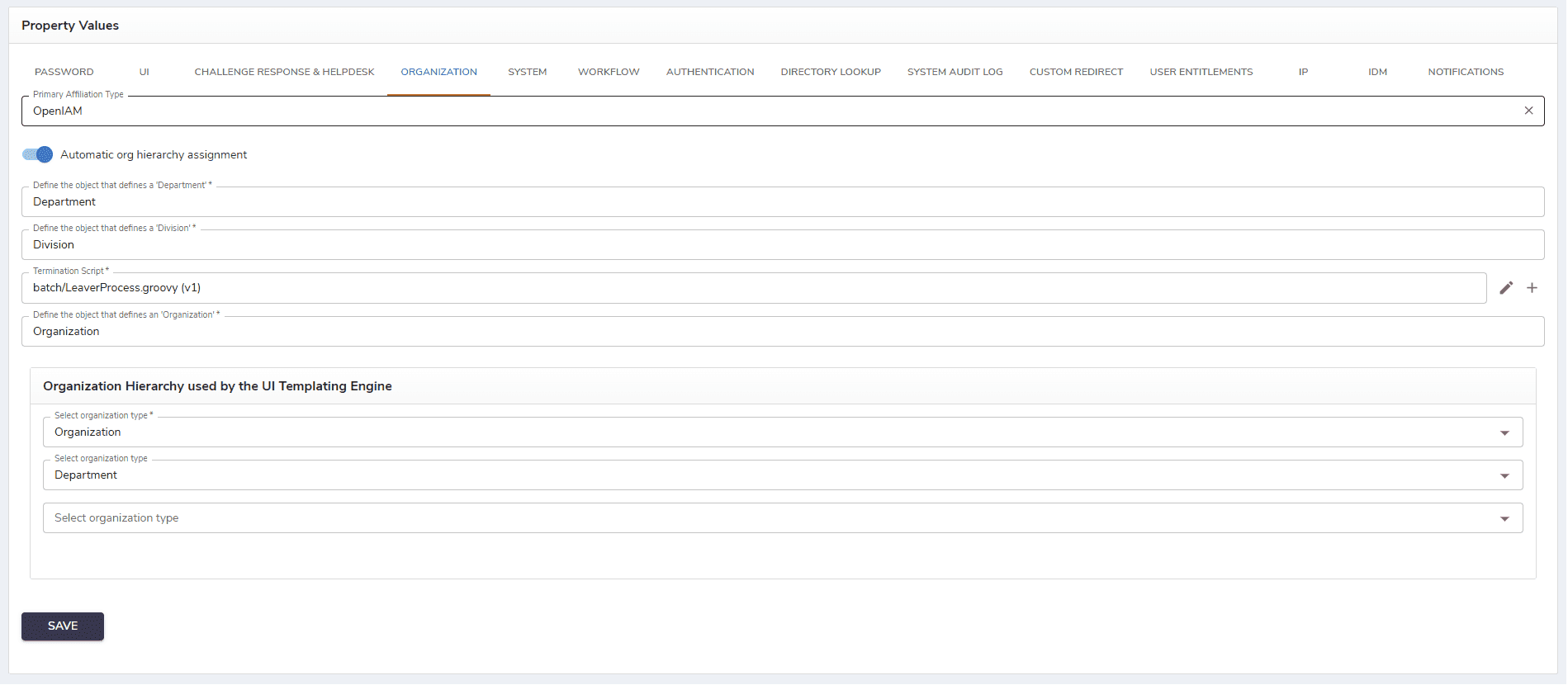 The default organizational hierarchy in OpenIAM is built around a three-tier structure: Organization > Division > Department. However, in this tab, users can customize it by creating their own hierarchy among their pre-created organization types with more than three tiers.