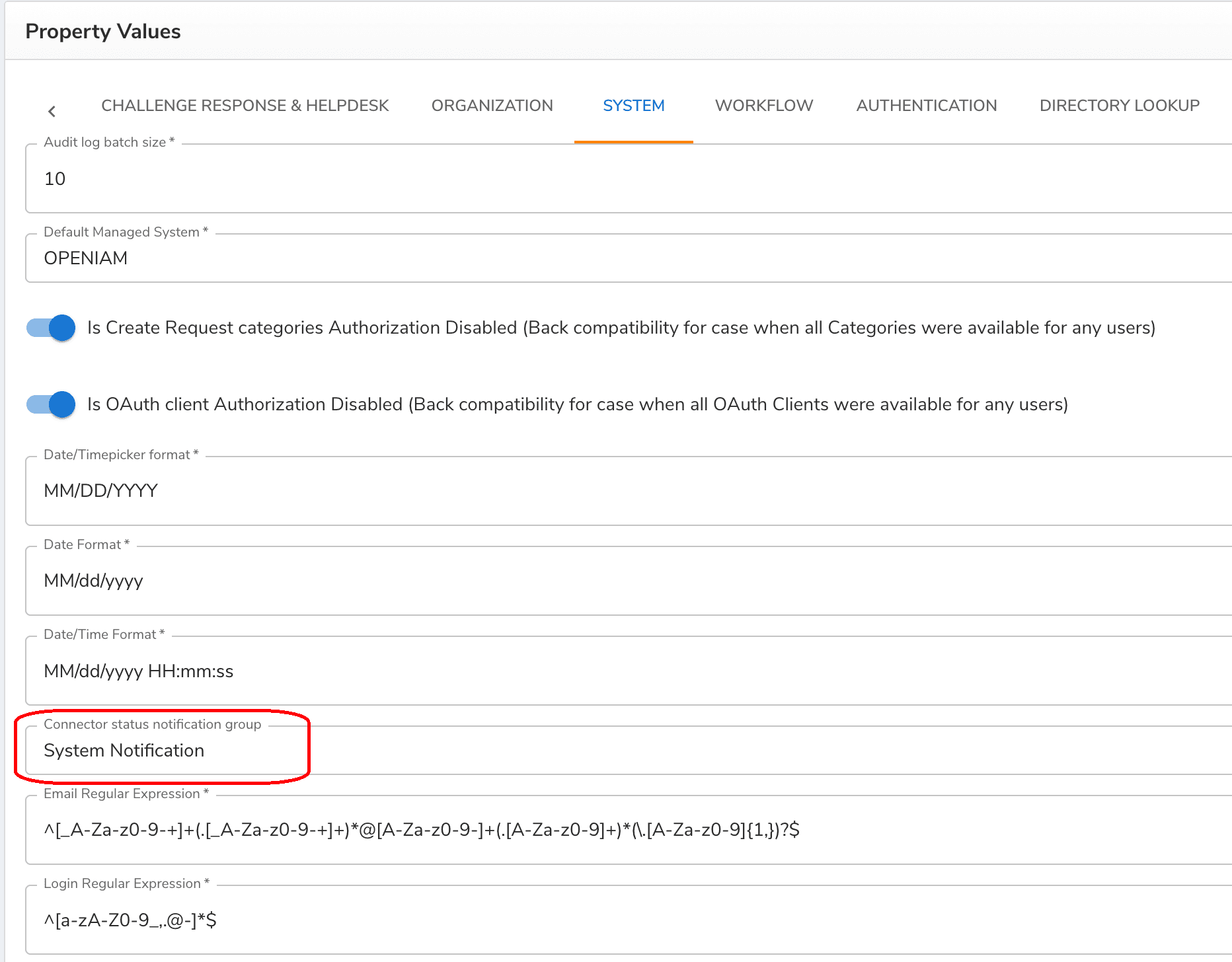To enable connector health checks, log in to webconsole and navigate to Administration > System configuration > System tab. Scroll down to the Connector status notification group.