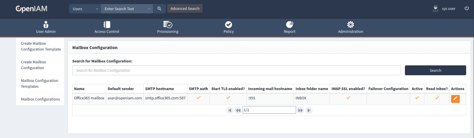 You will be redirected to the page with list of the predefined Mailbox Configurations. By default, there will be configuration related to the previously installed OpenIAM version or configuration related to the previous "System configuration" -> "SMTP Gateway" page.