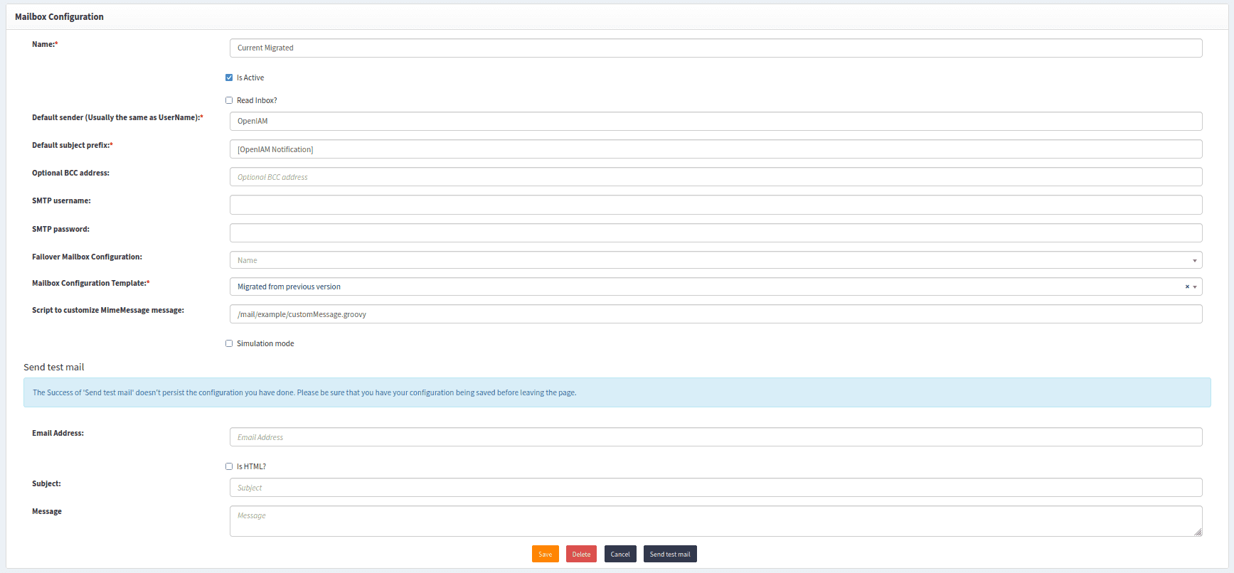 The same page is displayed to edit mailbox Configuration Template as well. To delete the Template please be sure that there isn't any linked to it Mailbox Configurations, otherwise system will throw an error: