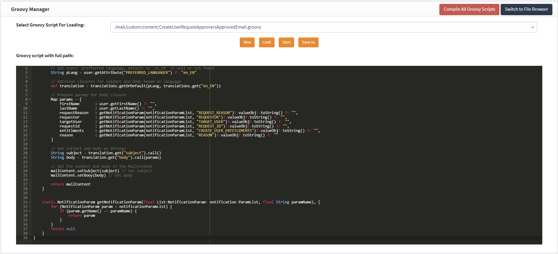 - Open groovy manager and add custom language handler for a mail template, as shown below. Note: This script is defined for the mail template individually.
