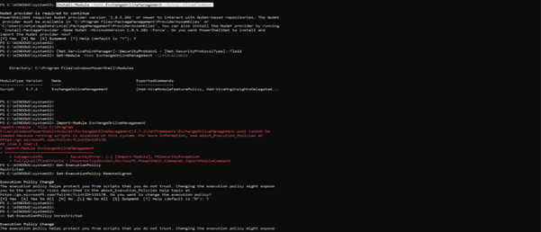[Net.ServicePointManager]::SecurityProtocol = [Net.SecurityProtocolType]::Tls12Install-Module -Name ExchangeOnlineManagement -Force -AllowClobber