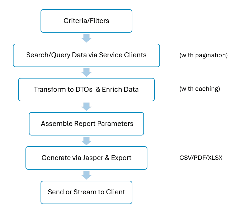 From a performance perspective, several aspects must be taken into account. Query optimization plays a key role: reports typically use pagination of 100–500 records per batch, with ElasticSearch enabled where available, and employ caching of service calls through in-memory maps such as HashMap. Additionally, date range filtering is applied on the backend to limit query scope and improve efficiency.