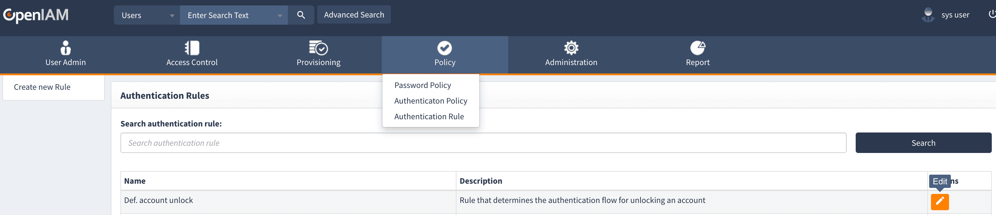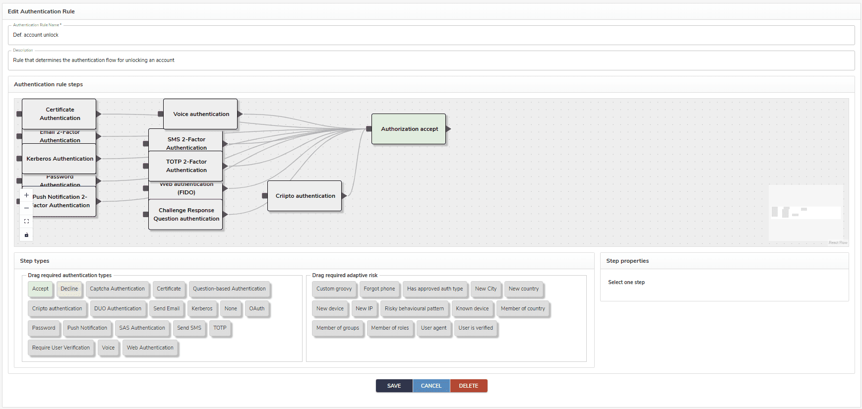 - Select def. Account Unlock in the Authentication Rules list. This rule defines the authentication flow for unlocking an account.
