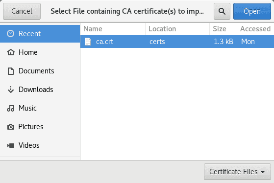 ca.keyis the private key and must be stored securely. It is used to sign client certificates.ca.crtis the certificate that should be installed both in Apache and in the client’s browser.file.srlstores the current serial number and must be incremented each time a new client certificate is signed.