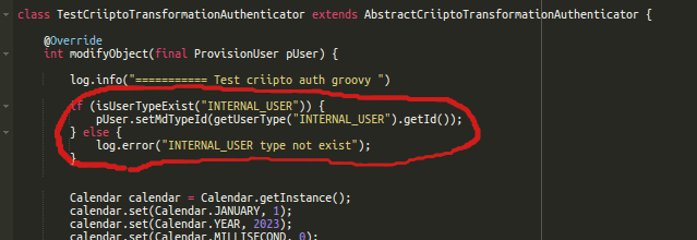 // Groovy script code hereimport org.openiam.idm.srvc.continfo.dto.Address;import org.openiam.idm.srvc.continfo.dto.EmailAddress;import org.openiam.idm.srvc.continfo.dto.Phone;import org.openiam.idm.srvc.grp.dto.Group;import org.openiam.idm.srvc.org.dto.Organization;import org.openiam.idm.srvc.res.dto.Resource;import org.openiam.idm.srvc.role.dto.Role;import org.openiam.provision.dto.ProvisionUser;import org.openiam.ui.groovy.criipto.AbstractCriiptoTransformationAuthenticator;import org.openiam.idm.srvc.user.dto.UserAttribute;import java.util.Calendar;class TestCriiptoTransformationAuthenticator extends AbstractCriiptoTransformationAuthenticator {@Overrideint modifyObject(final ProvisionUser pUser) {log.info("=========== Test criipto auth groovy ")if (isUserTypeExist("INTERNAL_USER")) {pUser.setMdTypeId(getUserType("INTERNAL_USER").getId());} else {log.error("INTERNAL_USER type not exist");}Calendar calendar = Calendar.getInstance();calendar.set(Calendar.JANUARY, 1);calendar.set(Calendar.YEAR, 2023);calendar.set(Calendar.MILLISECOND, 0);calendar.set(Calendar.SECOND, 0);calendar.set(Calendar.MINUTE, 0);calendar.set(Calendar.HOUR, 0);Role role = getRoleById("9");if (role != null) {addUserRoleByName(pUser, role.getName(), null, ["IS_CERTIFIED"].toSet(), calendar.getTime(), calendar.getTime(), "Role description");}Group group = getGroupById("SUPER_SEC_ADMIN_GRP");if (group != null) {addUserGroupByName(pUser, group.getName(), null, ["IS_CERTIFIED"].toSet(), calendar.getTime(), calendar.getTime(), "Group description");}Resource resource = getResourceById("0");if (resource != null) {addUserResourceByName(pUser, resource.getName(), ["IS_CERTIFIED"].toSet(), calendar.getTime(), calendar.getTime(), "Role description");}Organization org = getOrganizationById("100");if (org != null) {addUserOrganization(pUser, org.getName(), "ORGANIZATION", ["IS_CERTIFIED"].toSet(), calendar.getTime(), calendar.getTime());}if (isEmailTypeExist("PRIMARY_EMAIL")) {final EmailAddress email = new EmailAddress();email.setEmailAddress("test@email.com");email.setMdTypeId(getEmailType("PRIMARY_EMAIL").getId());addUserEmailAddress(pUser, email);}if (isPhoneTypeExist("OFFICE_PHONE")) {final Phone phone = new Phone();phone.setAreaCd("456");phone.setPhoneNbr("7890");phone.setCountryCd("+123");phone.setMdTypeId(getPhoneType("OFFICE_PHONE").getId());addUserPhone(pUser, phone);}if (isAddressTypeExist("OFFICE_ADDRESS")) {final Address address = new Address();address.setCountry("Country");address.setCity("City");address.setAddress1("Address 1");address.setMdTypeId(getAddressType("OFFICE_ADDRESS").getId());addUserAddress(pUser, address);}UserAttribute attrVal = pUser.getAttribute("MitID_municipality");if (attrVal && attrVal.getFirstValue()) {addUserAttribute(pUser, "MUNICIPALITY_NAME", attrVal.getFirstValue());pUser.removeAttributes(attrVal);}attrVal = pUser.getAttribute("MitID_municipality_code");if (attrVal && attrVal.getFirstValue()) {addUserAttribute(pUser, "MUNICIPALITY_CODE", attrVal.getFirstValue());pUser.removeAttributes(attrVal);}return 0;}}