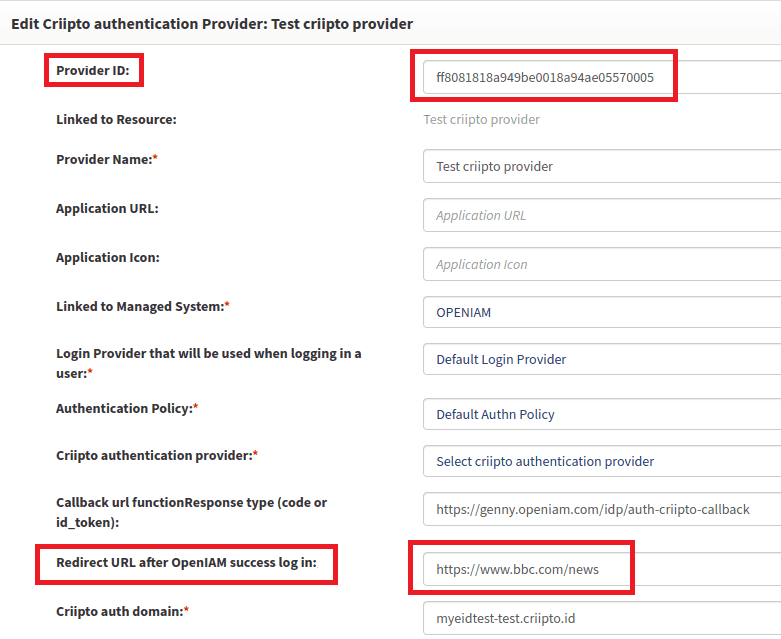 If you need several different redirect URLs, you can create several Criipto authentication providers with equal domains, secrets, etc., but with different “Provider ID” and “Redirect URL after OpenIAM success log in”.