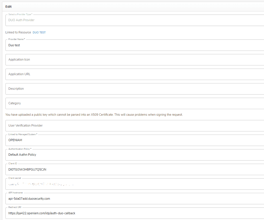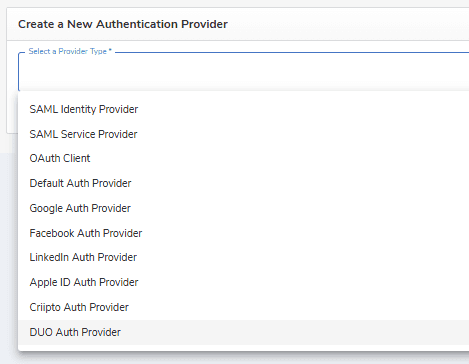 - Create a new authentication provider using the DUO authentication provider type, and fill in the required fields.