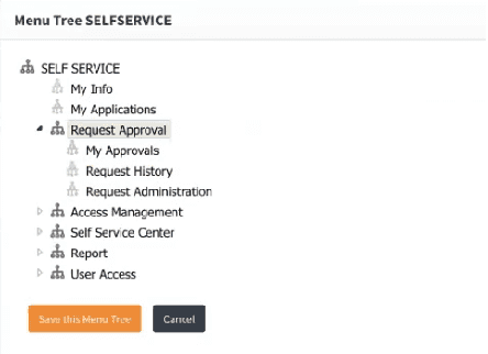 Here, you can see the menu-branches and the related menu-nodes. The example below shows the SelfService top-level menu and its affiliate objects.