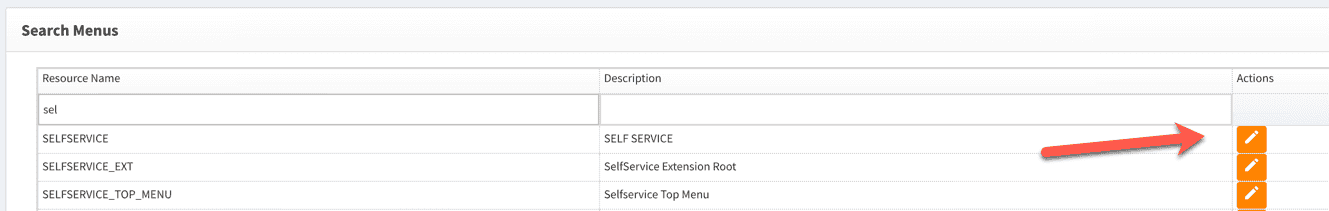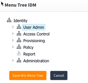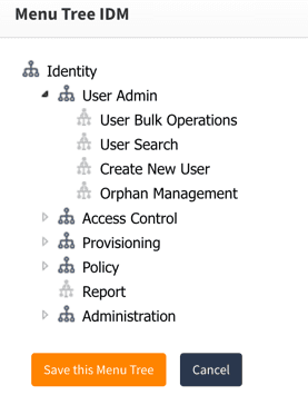 To access the top-level menus, you can search for either: IDM (webconsole) or SelfService. Find the required menu and click Actions to see the menu tree.