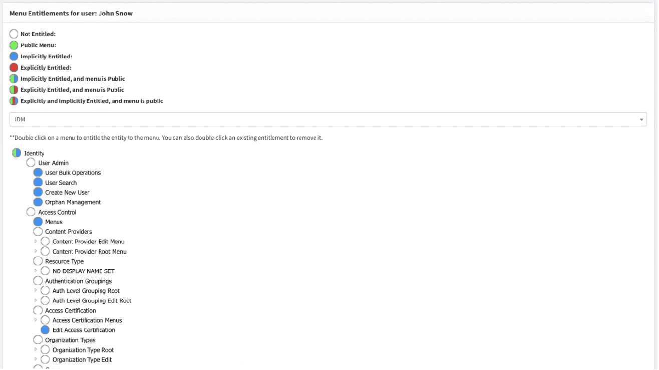 You will be able to see which menus the user is entitled to. Color-coding indicates how this entitlement is assigned; direct, through role, inheritance, etc. The entitlement template is shown below.