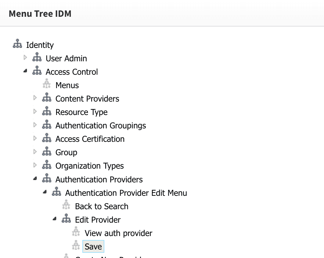 For example, you created a custom administrative role in Open IAM to provide access to operational staff. The role is working well except for the Save button being unavailable on the Authentication Provider screen. You can enable the save button on this screen by granting access to a menu, as shown below.