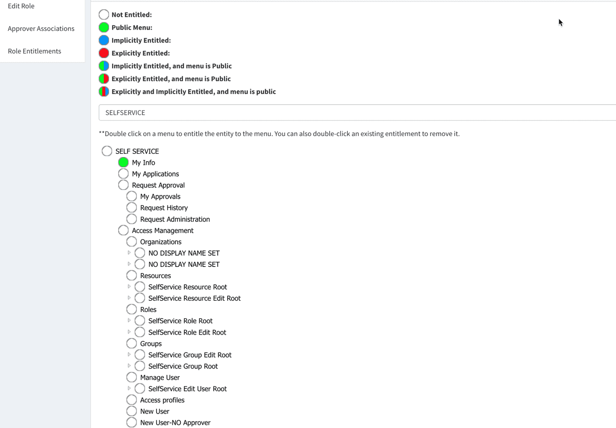 In this example, we will define a role that grants users access to the following menu options in the SelfService portal.