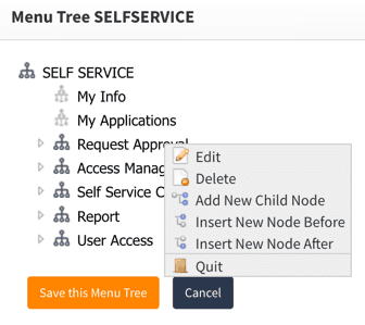 SELFSERVICEand click on the actions button for SelfService. - From the Menu tree shown below, right click on the menu that you want to update.