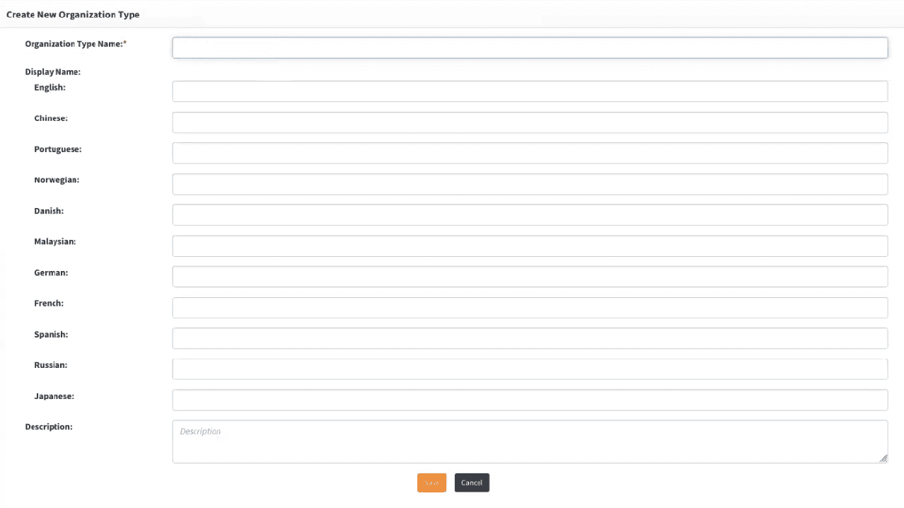Fill in the required fields and click Save. You can create as many organization types as needed.