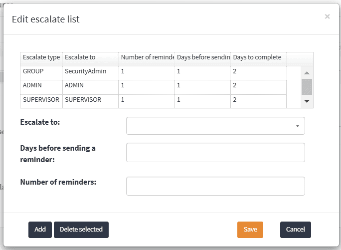 - Configure reminder frequency and days before escalation.
