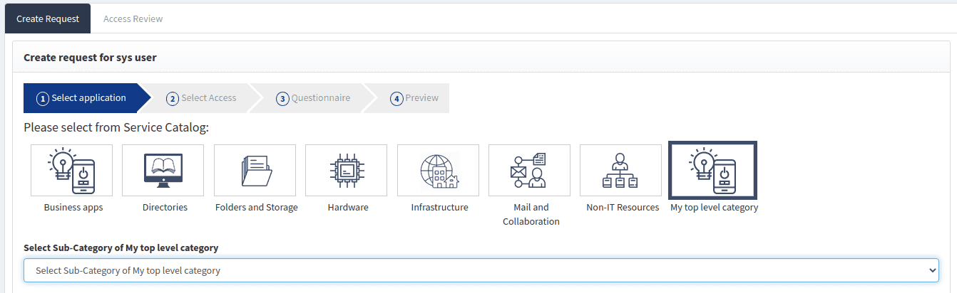 If you go to SelfService > Create request for myself > Select from service catalog, you will see that the catalog is structured by categories, as shown below. This structure is a default model, and you can customize it to meet your organization's needs. This categorization structure and appropriate naming can have a significant impact on how easily end-users can navigate the catalog and find what they need.