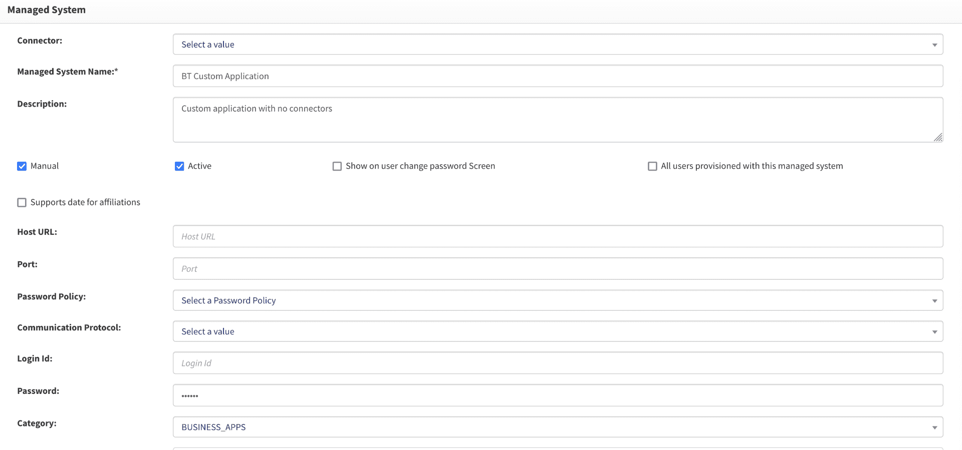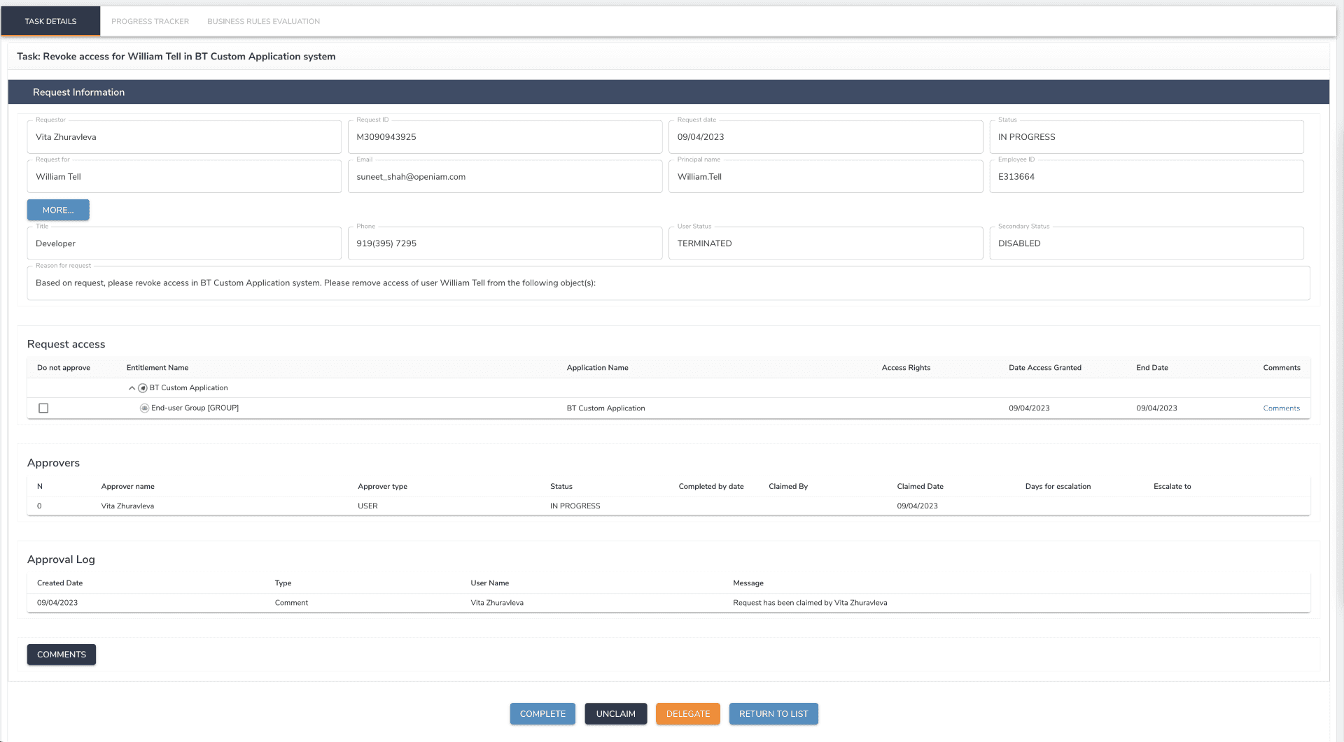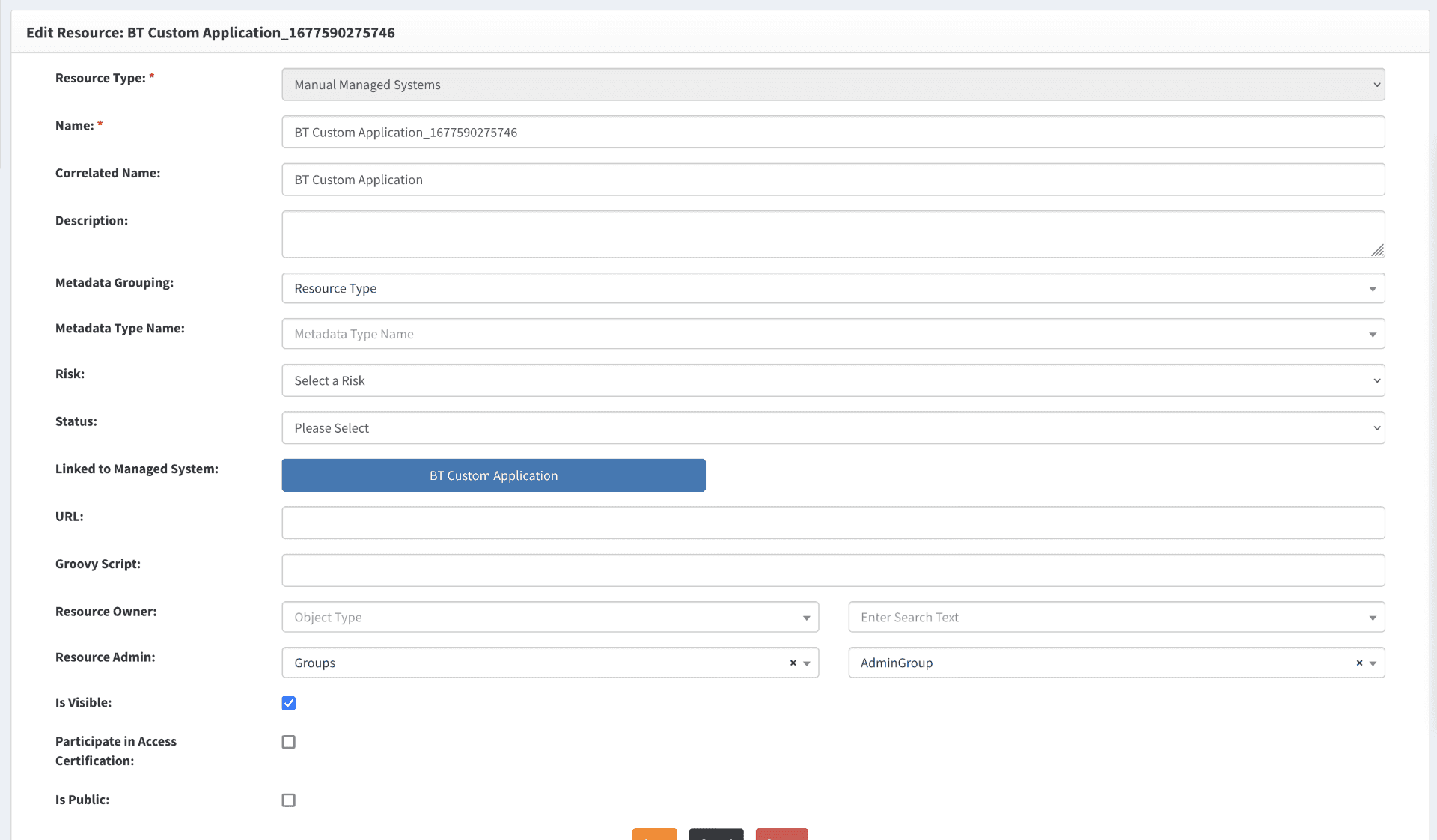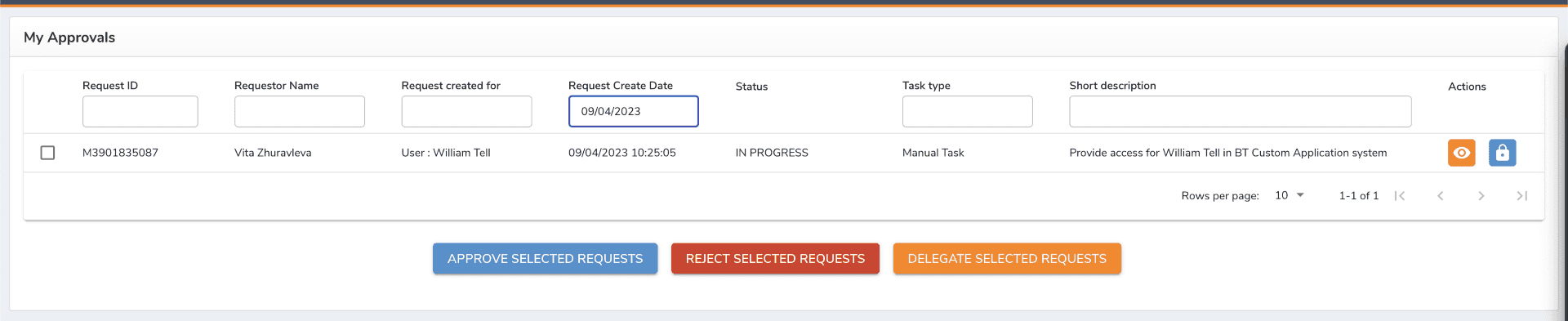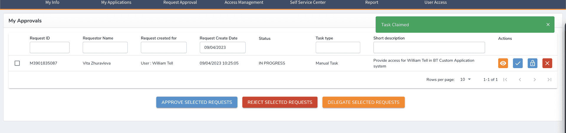 A manual task is generated when a request is made to grant or revoke access to a manual managed system. These tasks are assigned to the admin of the resource associated with the manual managed system, as shown below.