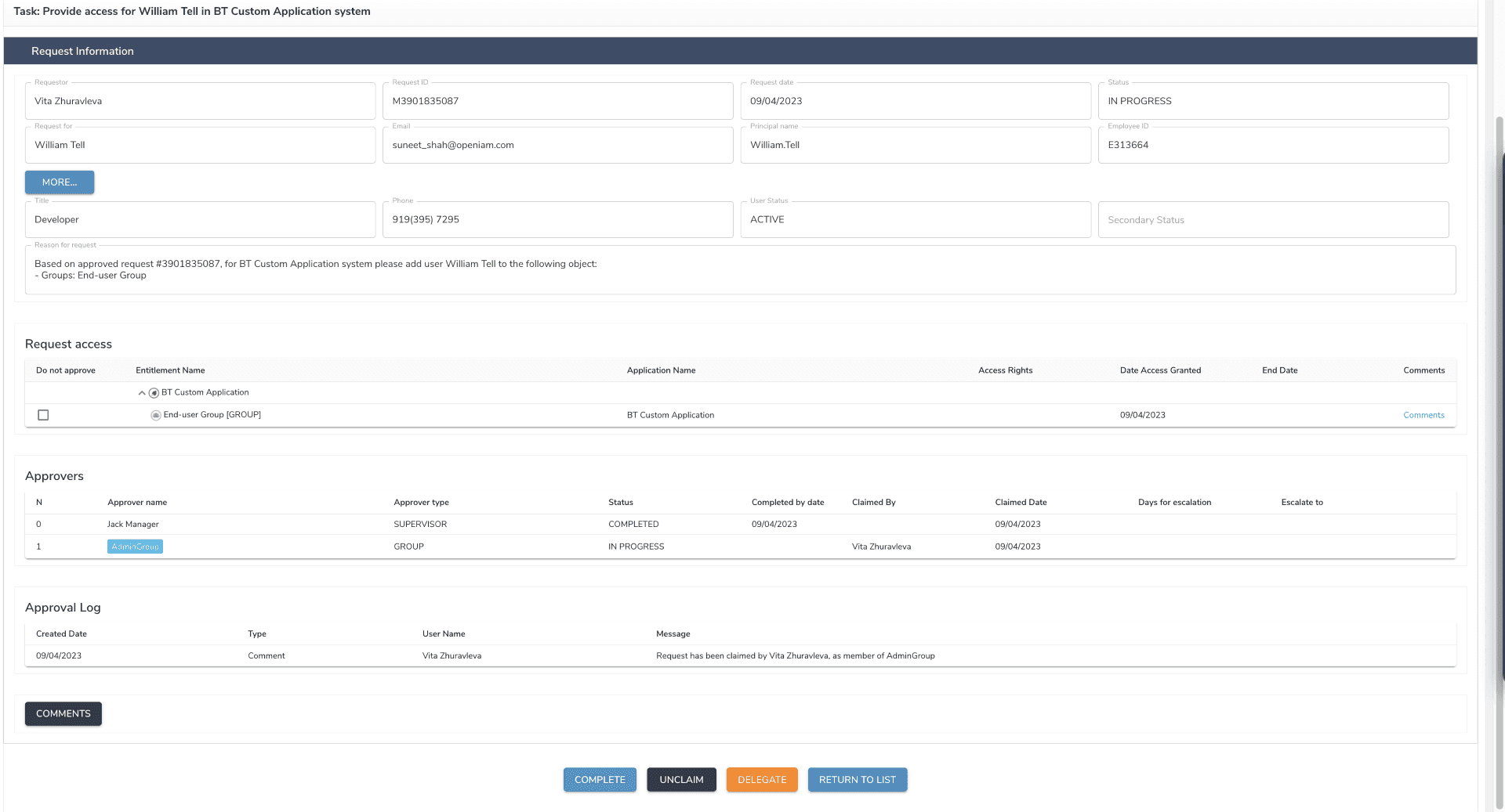 The admin who claimed the task can now complete the required action in the manual system and mark it as done in OpenIAM. (Note: At this point, the entitlement has already been assigned to the user; the manual task represents only the action the admin must take to provision or revoke access in the external system manually.)