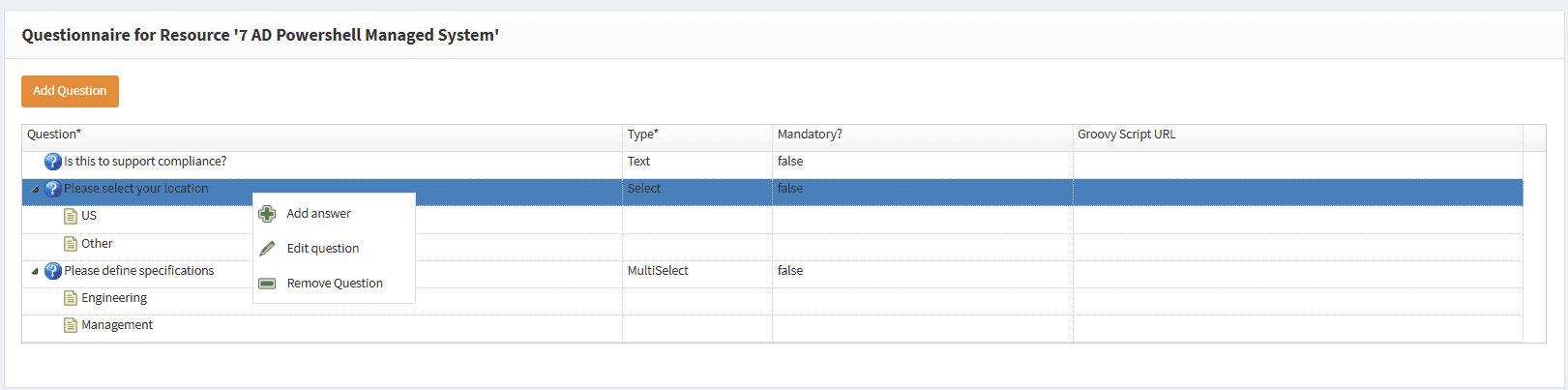 - Go to webconsole > Access request > Resource and find the resource for the Managed system you want to create a questionnaire for.