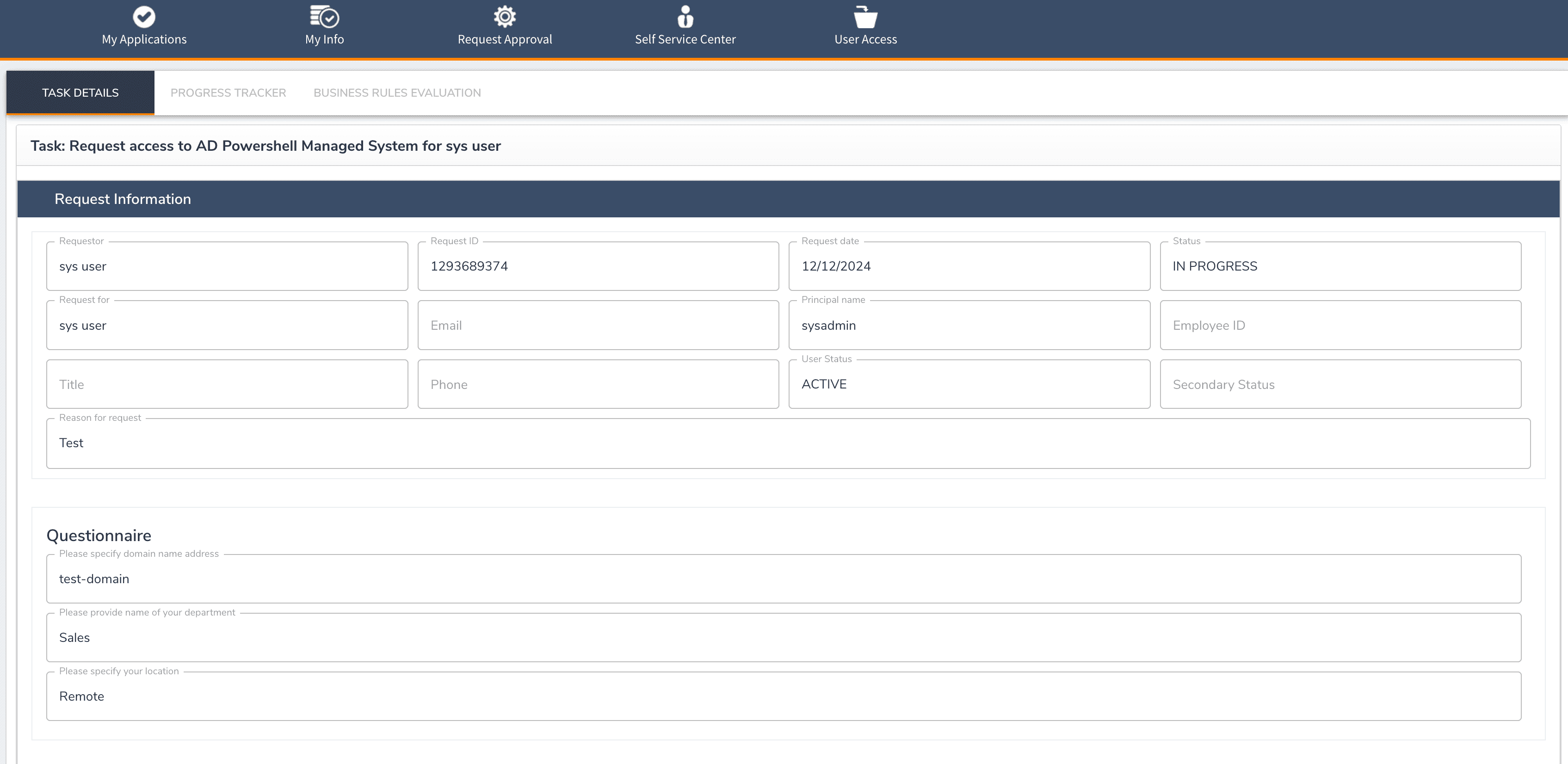 OpenIAM allows custom justification questions to be introduced at the application level. If this has been enabled, then the user will see additional questions on this form and the approver - the answers to those questions in the request information.