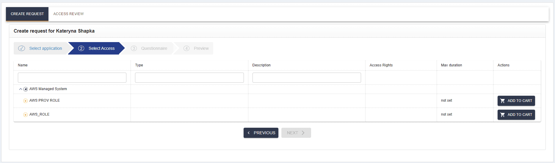 Note: To avoid the case of “Access Rights were not selected against the roles or groups assigned to the users” while creating access certification, make sure to select access rights user when assigning a user to a role. Access certification works if access rights are selected to the role or group for the users, which are certified. You can do that in SelfService when creating a request, as shown above.