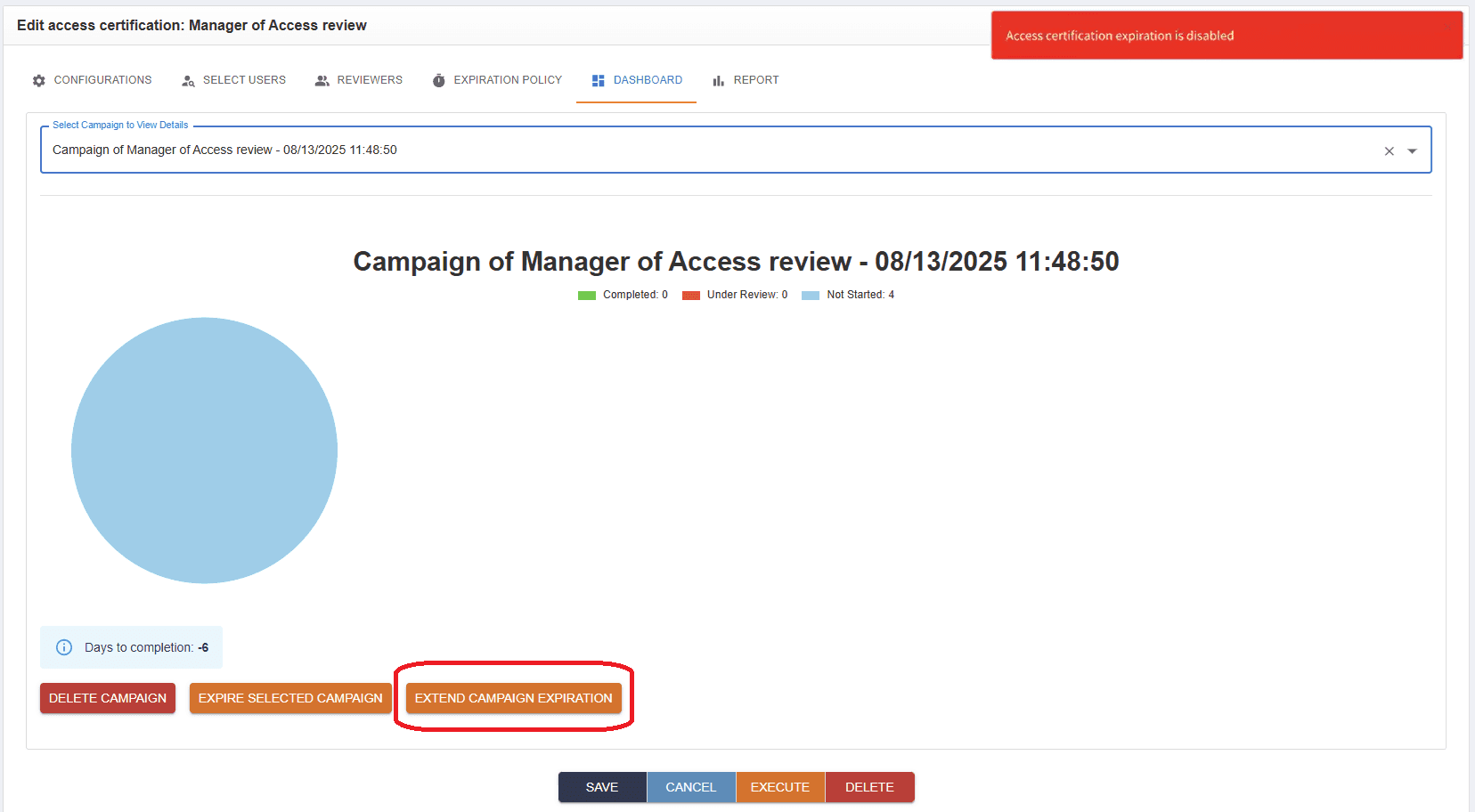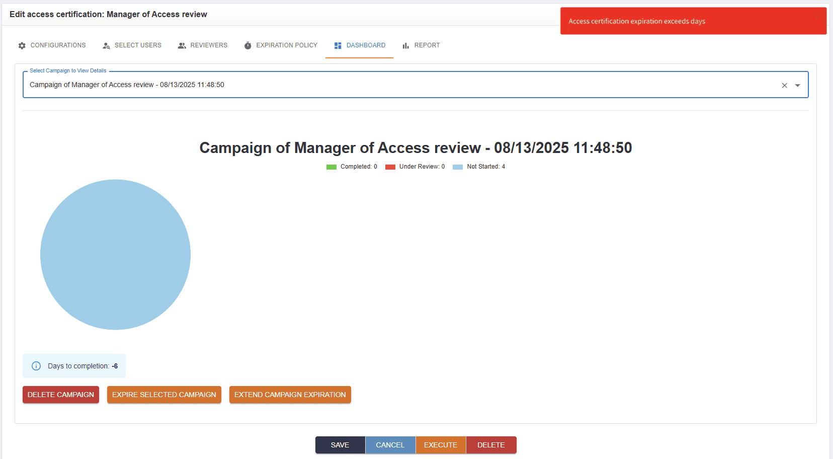 Starting from version 4.2.2 of OpenIAM, access review campaigns can be set to expire.