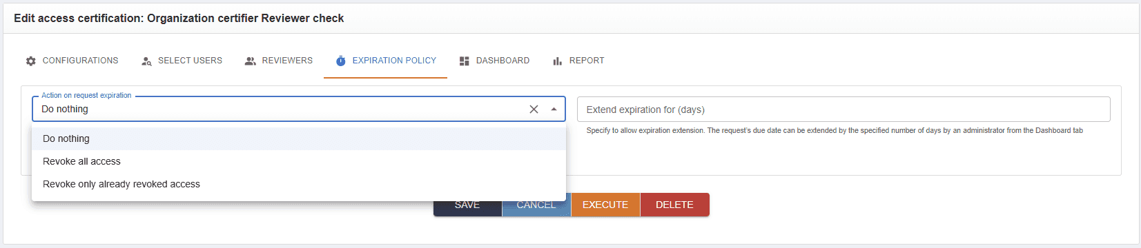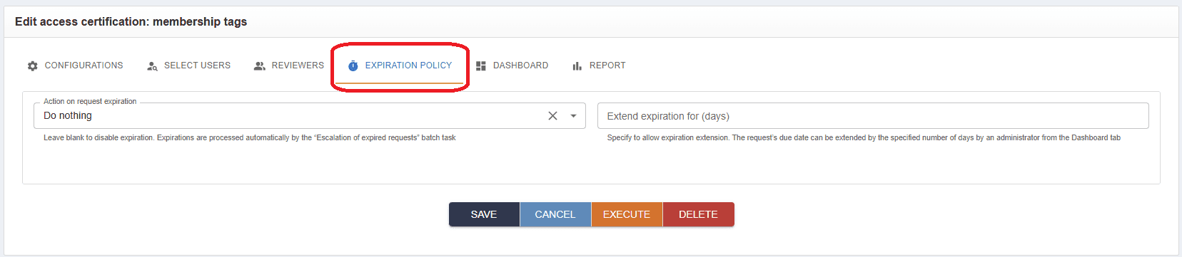 The task will locate requests with due dates in the past and handle their expiration. It applies not only to access certification requests but also to all requests with an assigned due date (termination, create access, etc.).